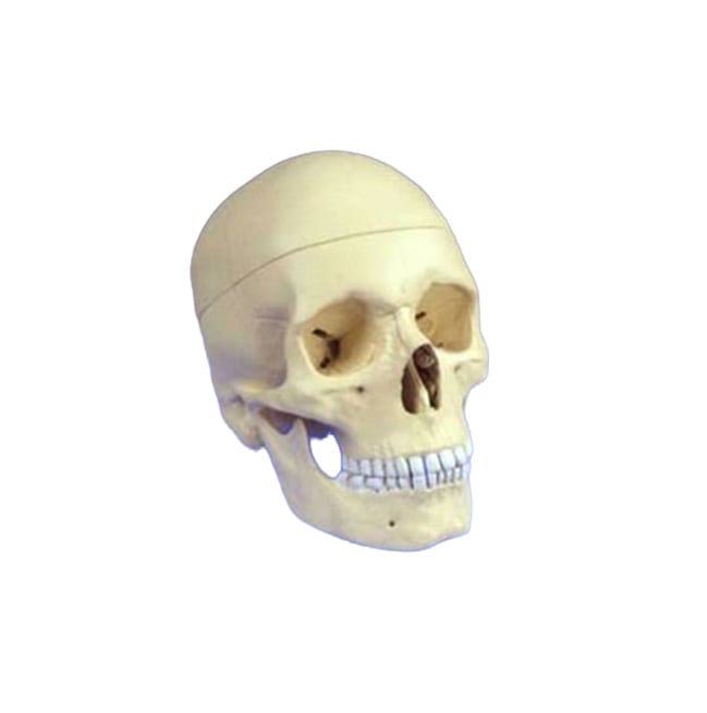 Tamaño natural, desarmable en 2 partes, mandíbula inferior móvil, bóveda del cráneo desmontable